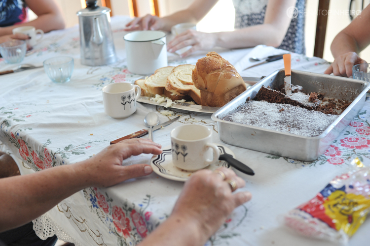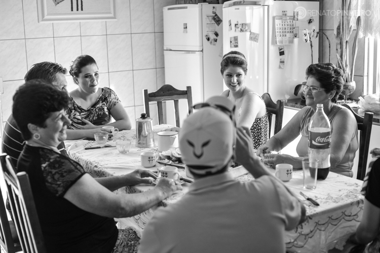 Pense que nesse na casa da noiva, na preparação dela pro casamento, teve até um baita café com cuca e pão caseiro, pense a delícia. E ali mesmo a família já foi se encontrando ao redor da mesa e colocando as prosas em dia.