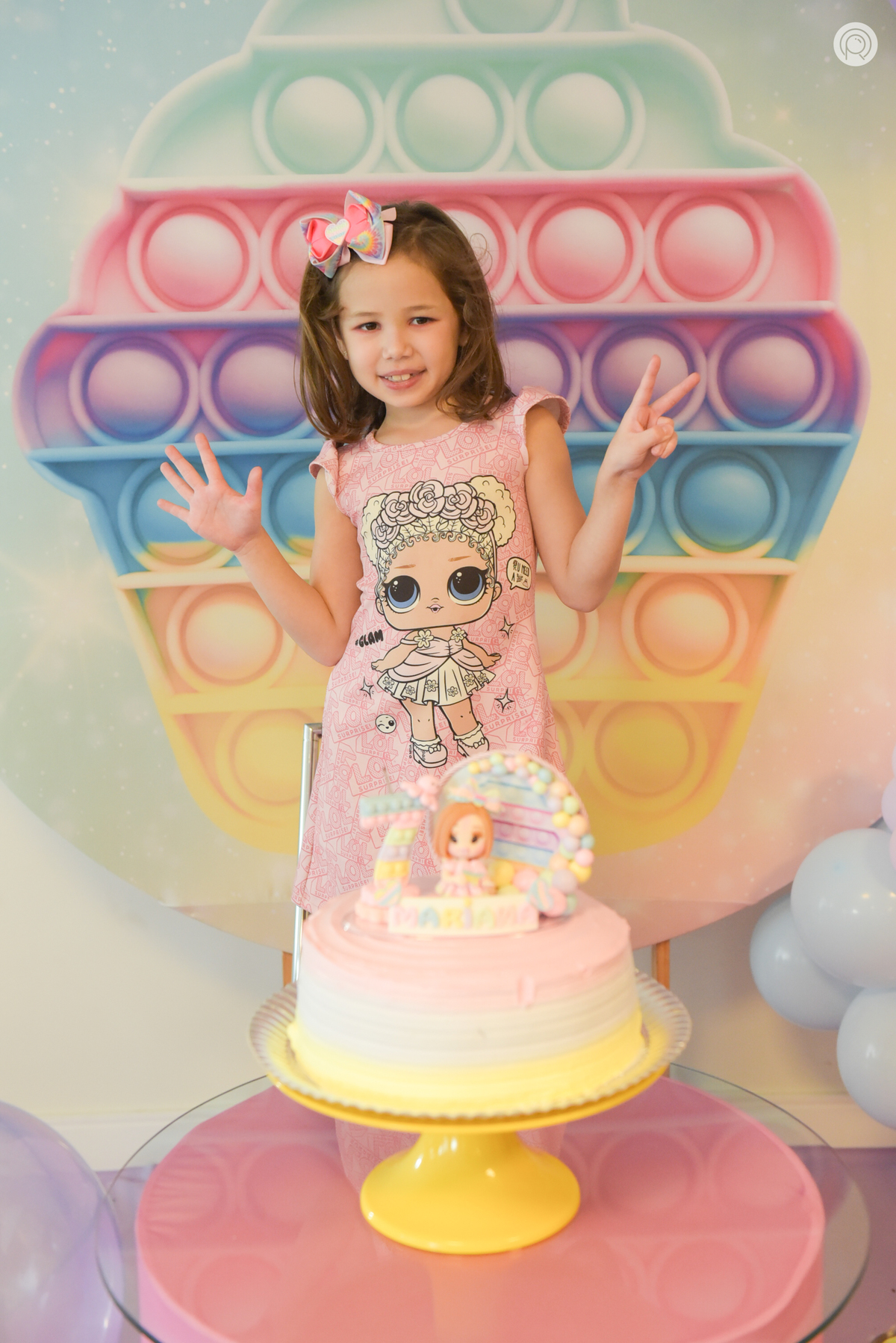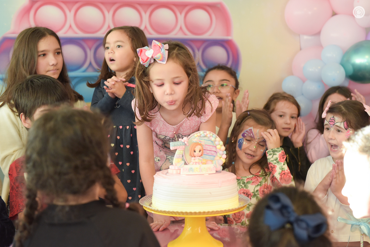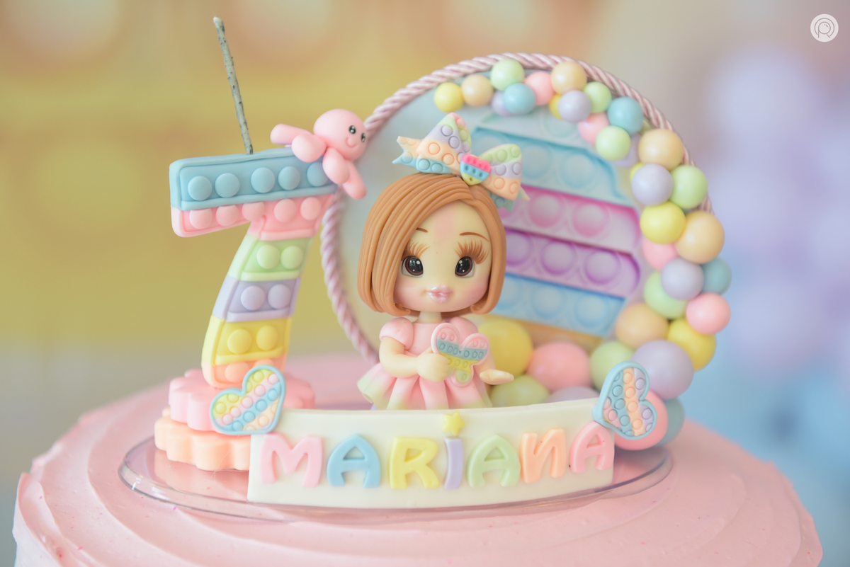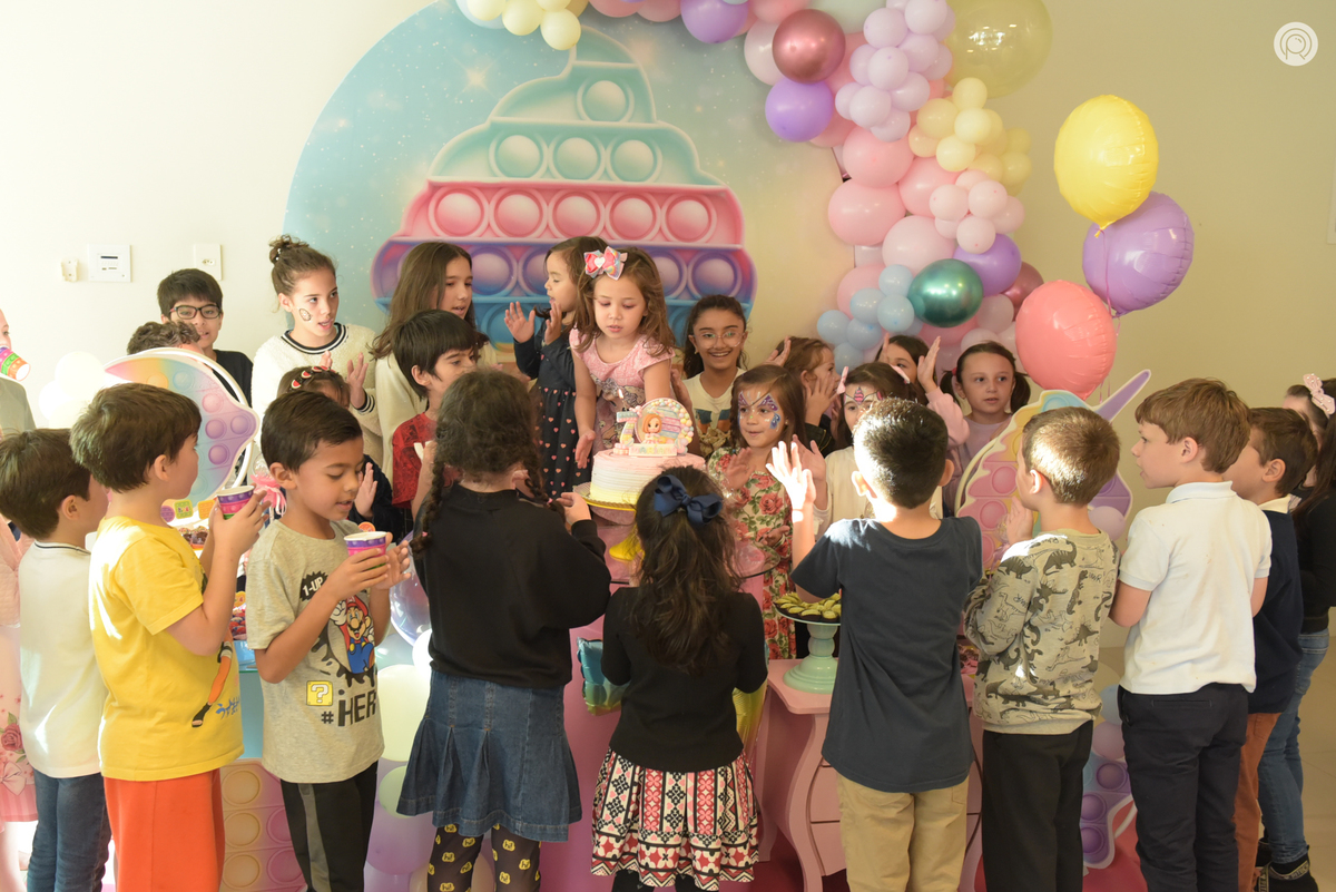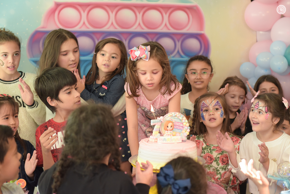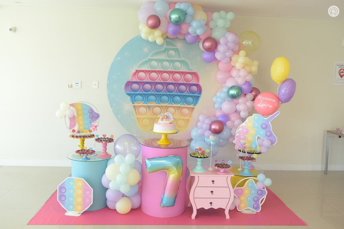 Os 7 anos da Mariana regado de muita bagunça, criançada reunida e claro cores de Pop It.